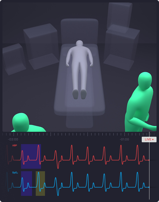To address this problem, it is crucial to identify what happened at the moment the dip occurred. We enabled a parameter graph to be displayed below the video feed in Focus view. Clicking on a specific point on the graph allows telehealth nurses to review the video footage from the bedside at that exact time.