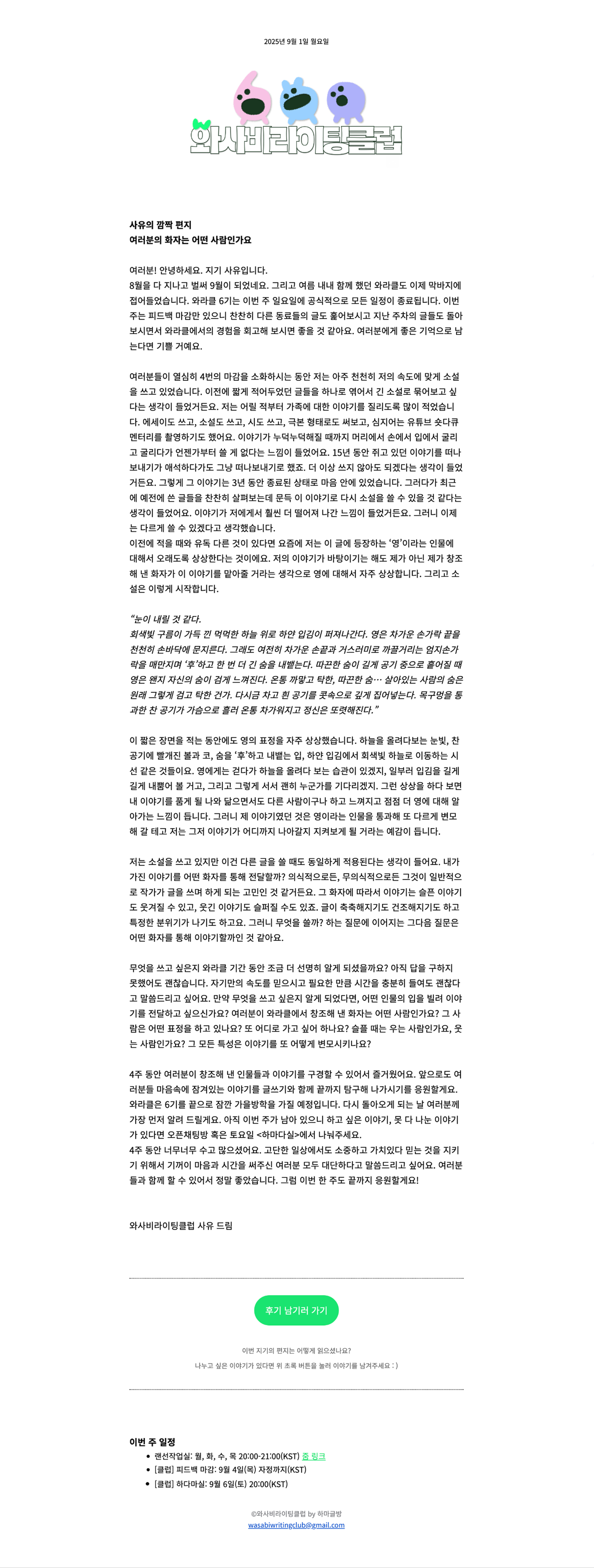 The name ‘Wasabi’ is inspired by wabi-sabi, an aesthetic philosophy rooted in the tea ceremony that finds beauty in what is rough, incomplete, lacking, and imperfect. Rather than flawless writing, Wasabi Writing Club values genuine stories that emerge from absence, uncertainty, and inner tremors. It is a space where each person discovers their own quiet light within imperfection and writes from it.